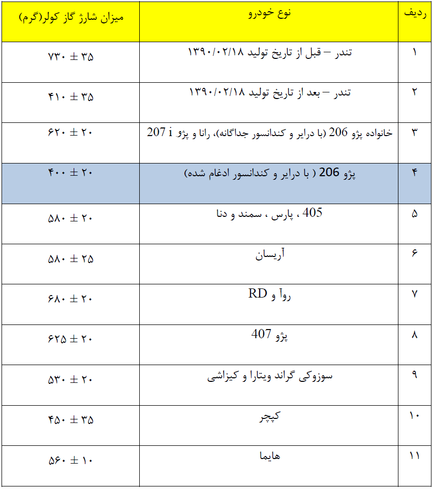 در این خودروها، مقدار گاز مورد نیاز بین ۶۰۰ تا ۷۰۰ گرم متغیر بود. اما در مدلهای جدید که از گاز R134a استفاده میکنند، این میزان کاهش یافته و در بازهای بین ۴۵۰ تا ۵۵۰ گرم قرار گرفته است.